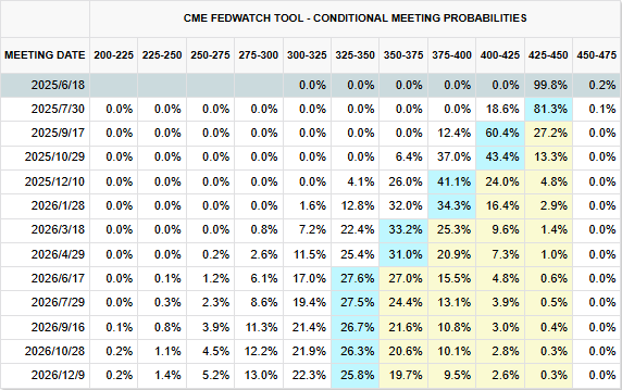 但市场对特朗普的喊话却毫无波澜,据CME Group美联储观察工具显示,截至发稿,美国6月维持利率不变的概率为99.8%,7月维持利率不变的概率为27.2%,降息25个基点的概率为18.6%。9月降息25个基点的概率为60.4%,降息50个基点的概率12.4%。