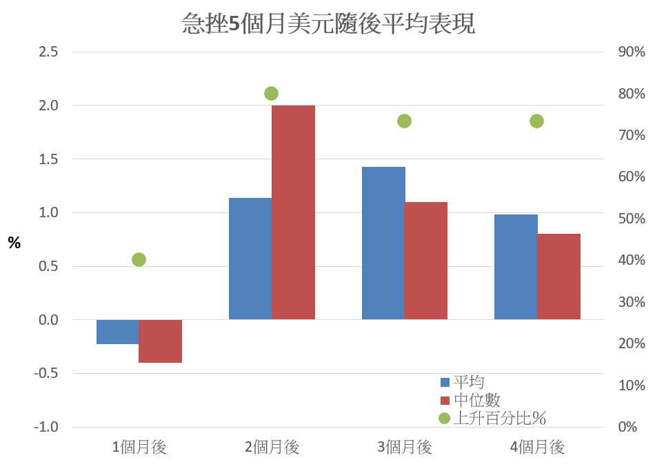 换言之,若本轮跌势与历史走势相若,未来1个月美元仍有机会偏弱,但在随后2至4个月,出现回升/反弹并录得正回报的机率却相对较高,且机率高达七成以上,具一定参考价值。