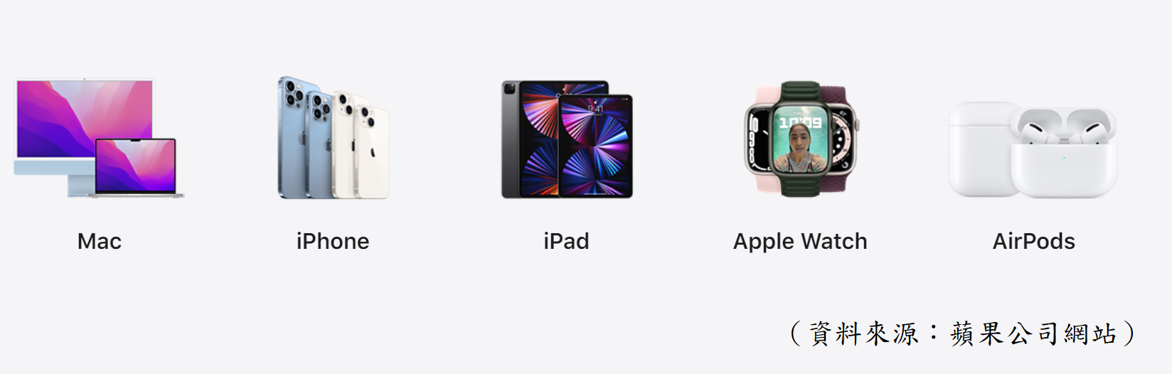 苹果公司设计及出售各种电子消费产品,包括智能手机 (iPhone)、平板电脑(iPad)、电脑(Mac)、智能手表 (Apple Watch)、AirPods、电视盒(Apple TV)等,其中iPhone为苹果的主打产品。