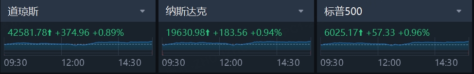 美东时间周一,美股三大指数集体收涨,中东地缘局势出现了缓和迹象,且多位美联储官员释放了降息的信号。截至收盘,道指涨374.96点,涨幅为0.89%,报42581.78点;纳指涨183.56点,涨幅为0.94%,报19630.97点;标普500指数涨57.33点,涨幅为0.96%,报6025.17点。