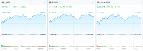 6月24日(周二),港股三大指数呈现高开高走行情,恒生指数涨2.06%上扬近500点重回两万四关口,国企指数、恒生科技指数分别上涨1.9%及2.14%,三大指数均录得3连涨。
