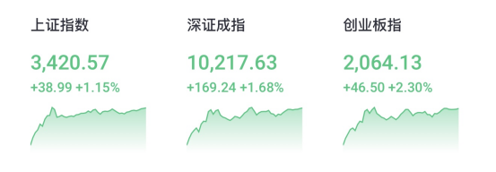 A股三大指数全天震荡走高,截至收盘,沪指涨1.15%再度站上3400点,深成指涨1.68%,创业板指涨2.3%。沪深两市全天成交额1.41万亿,较上个交易日放量2920亿。