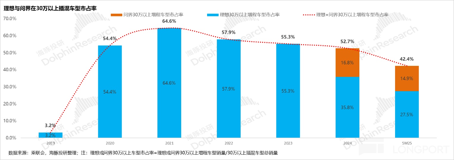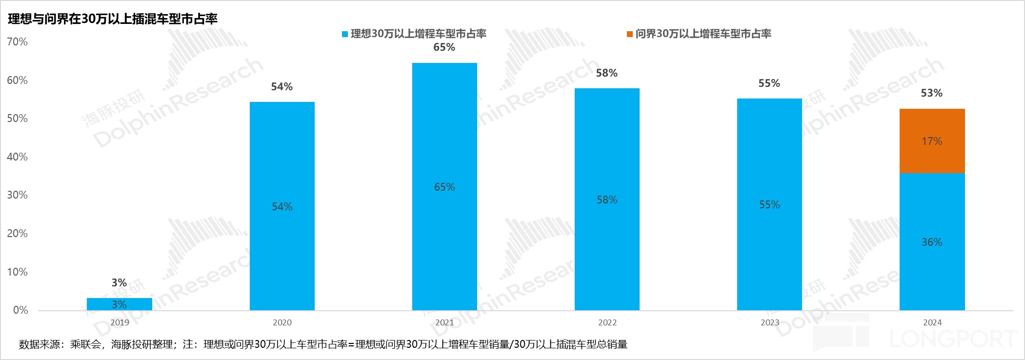 从理想30万以上增程车型的市占率来看(理想30万以上增程车型销量/30万以上插混车型总销量),在中高端增程先发优势确实给理想构建了长达接近4-5年的领先期。理想30万以上插混车型市占率一直占据超半壁江山。