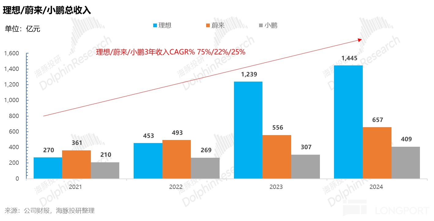 所以由此看出,理想不仅可以享受到30万以上细分赛道由插混持续拉市占的行业beta红利,同时也凭借先发者优势构建了自身的alpha,理想销量和收入高增的红利期也持续了将近4-5年,也成为了蔚小理三强争霸赛中销量和收入增速最高,和目前市值最高的新势力。