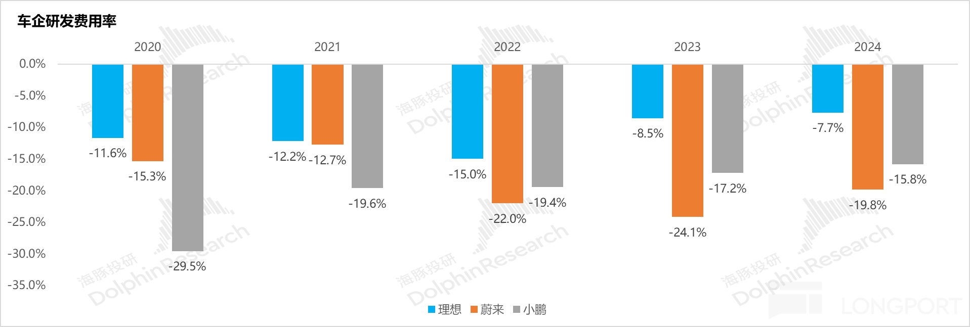 而从车企的研发费用来看,理想在2024年收入体量是蔚来的2.2倍时,研发费用在2024年比蔚来还要低20亿,研发费用率也由于享受到中高端增程红利带来销量杠杆效应的优势释放持续处于行业低位。