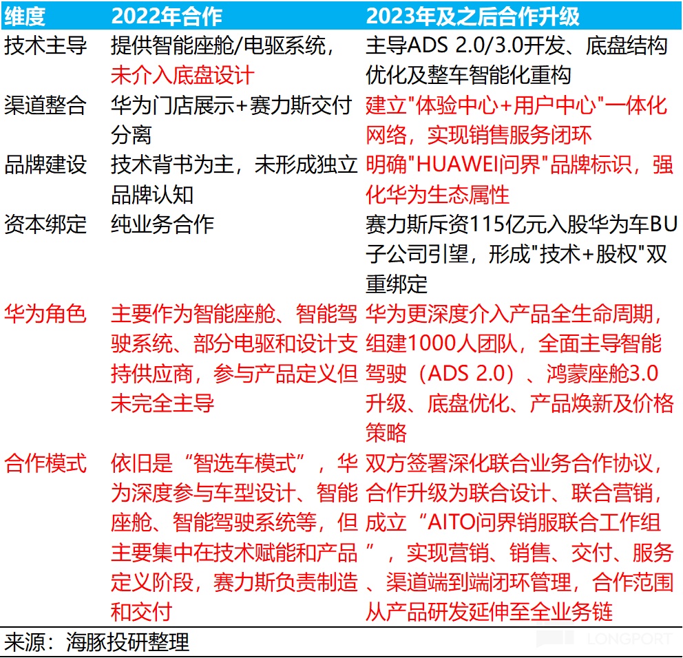 ③合作效率:赛力斯作为行业弱势方,能主动让渡主导权,更易接受华为在研发、渠道、营销等环节的主导权,减少自主权博弈,合作更高效;
