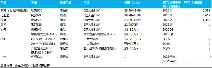 2025年除了直接竟对问界之外,入局中高端增程/插混SUV玩家日益增多,理想增程基本盘面临的竞争也持续加大: