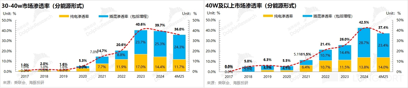 从目前的结果端来验证,30万以上市场仍以插混(包括增程)在持续拉渗透率,而纯电的渗透率甚至呈现下滑趋势。