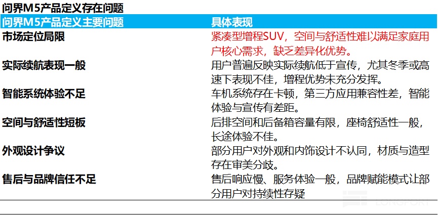 M5产品定义问题:M5定义为紧凑型增程SUV,空间与舒适性很难满足家庭用户核心需求。