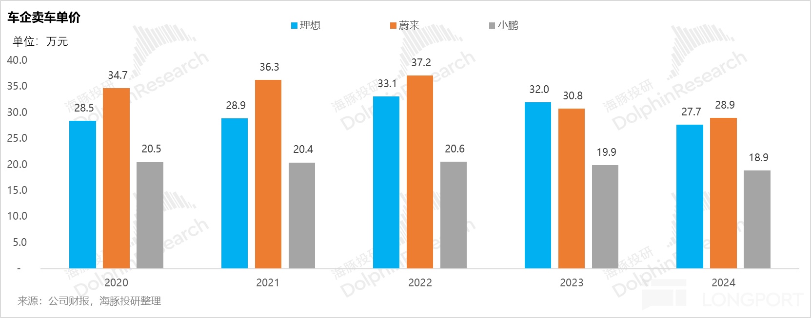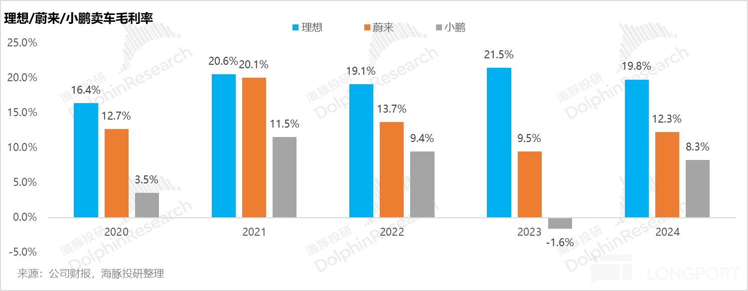 虽然由于电池成本的下行,以及新能源车企竞争的逐步加大面临的行业层面的产能过剩,蔚小理三家的卖车ASP自2022年起也持续处于下行轨道之中,但理想的卖车毛利率最为稳健,基本能保持在20%上下,是蔚小理中卖车毛利率最高的车企。而蔚来在2024年卖车单价比理想还要高时,卖车毛利率却下滑到仅12%。