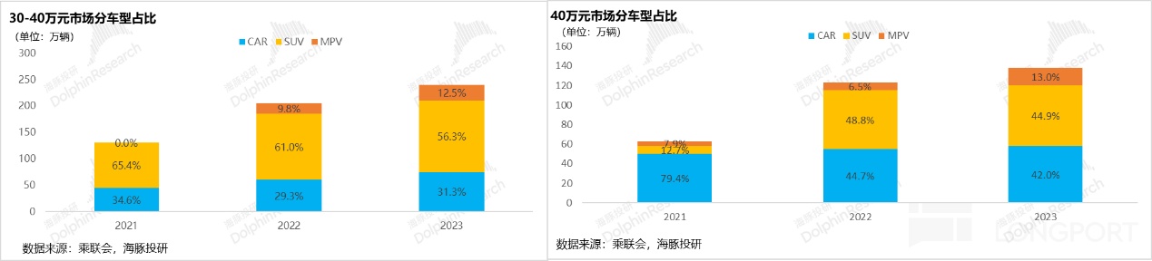 从30万以上市场的需求变迁来看,SUV快速崛起,基本占据了半壁江山,2023年SUV占30万以上整体乘用车销量比重达到52%(轿车仅占35%)。
