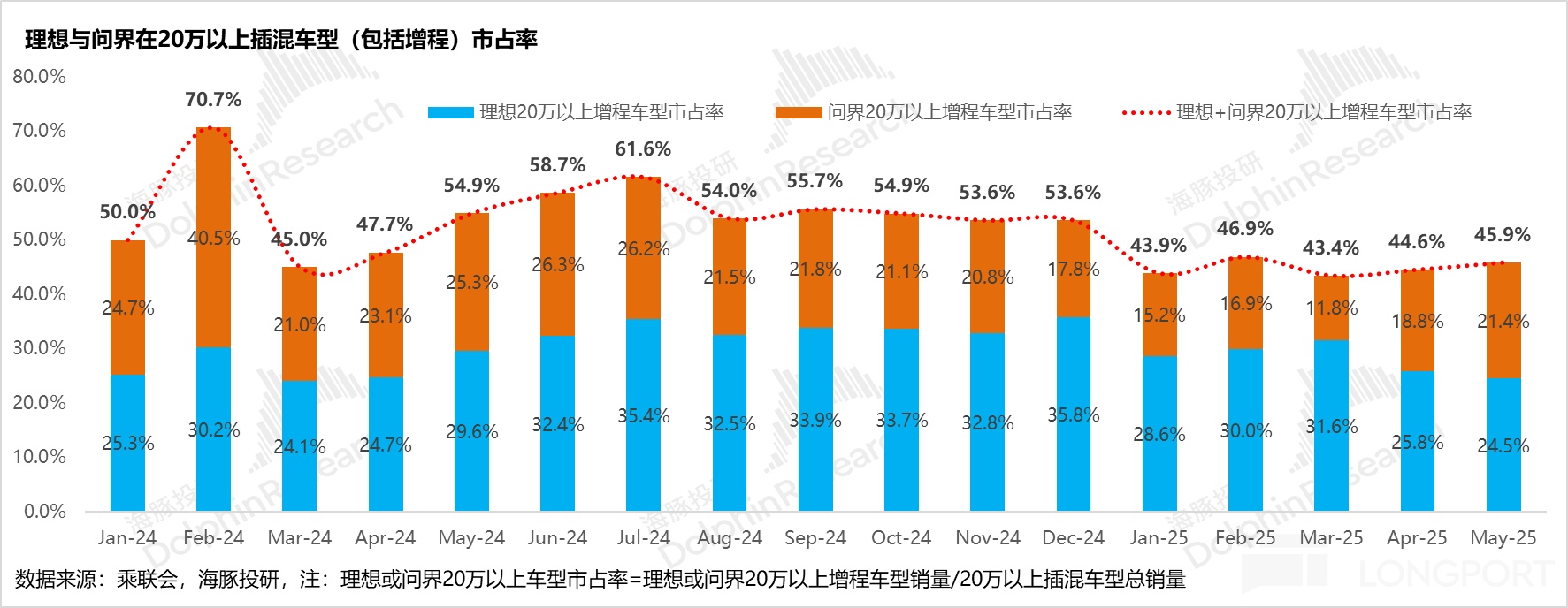 但在2025年1-5月,理想L6的市占率也开始下滑, 20万以上车型的市占率同样也下滑到2025年5月低点仅25%。