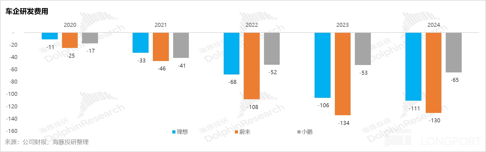 而这个处于相对低位的研发费用一方面确实因为理想的研发效率会比蔚来高效很多,另一方面也是因为增程的套娃车型本身也并不需要太多的研发费用的投入,也因此理想可以把更多的研发费用投入到下一个护城河的建设上(如理想在高端纯电蓝海赛道的尝试以及能影响到车企终局的智驾投入上)。