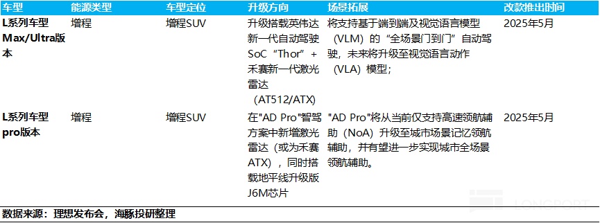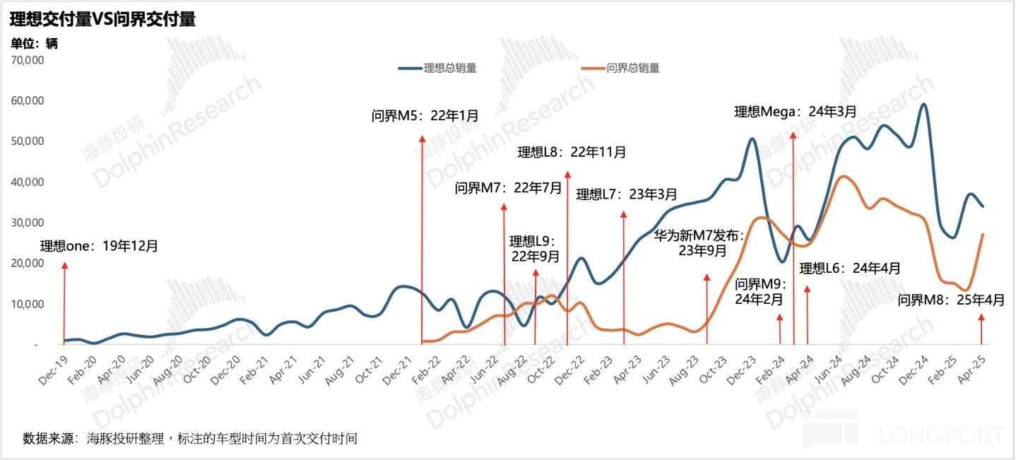 而今年理想增程改款已经全部出牌(改款力度相对较小),但下半年问界还有改款M7上市,理想增程基本盘车型改款力度已经越来越小(尤其是2025年的L系列小改款,基本仅升级智驾和激光雷达)。