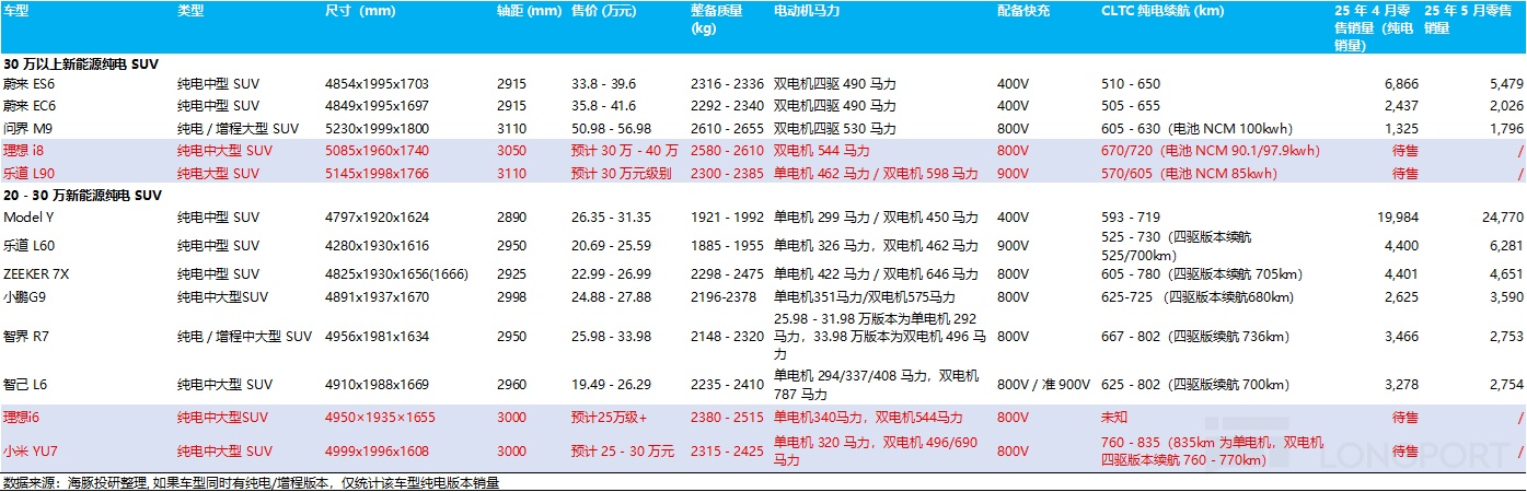 新能源品牌30万以上的SUV,因为要满足高端用户对于空间及全场景的需求,基本都是中大型全尺寸SUV且配备双电机四驱模式,但车重和多电机直接影响续航能力。