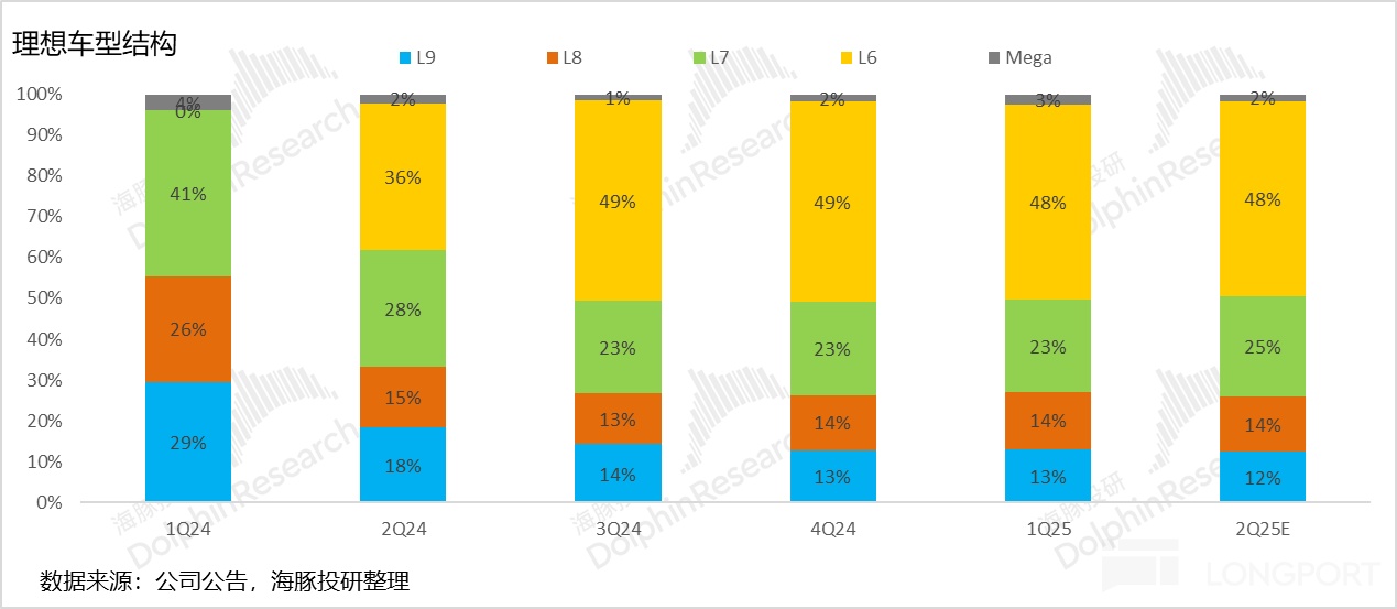 一般车企品牌降维都自带品牌势能优势,价格带从上往下打更容易,所以理想L6推出后也确实挽救了理想的销量,为理想2024年50万辆的实际销量贡献了接近20万辆,在2024年二季度及之后在理想车型结构中也占据了接近一半。