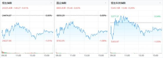 6月26日(周四),港股三大指数集体收跌,市场连涨后做多情绪谨慎。截止收盘,恒生指数跌0.61%,国企指数、恒生科技指数分别下跌0.63%及0.26%,三者均止步4连涨行情。