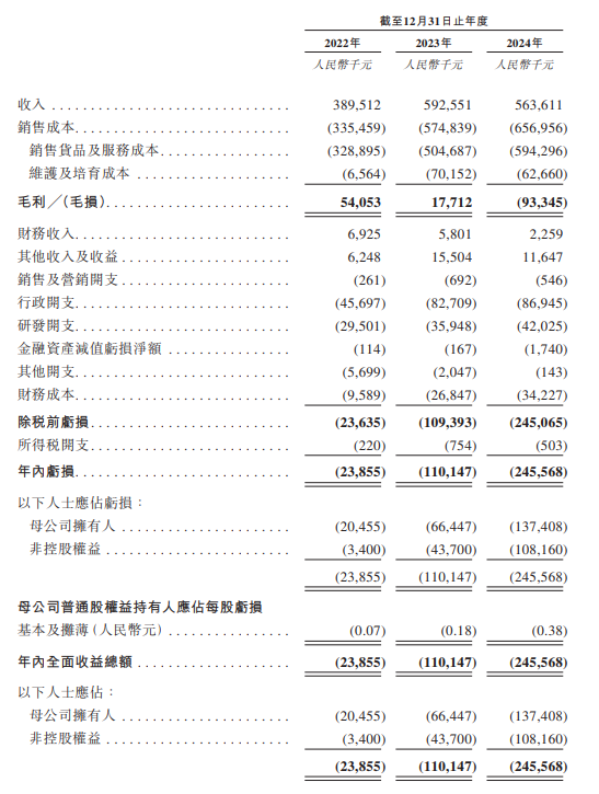 2022年-2024年,公司分別录得收入3.9亿元(人民币,下同)、5.93亿元、5.64亿元;对应同期,年内亏损2385.5万元、1.1亿元及2.46亿元。