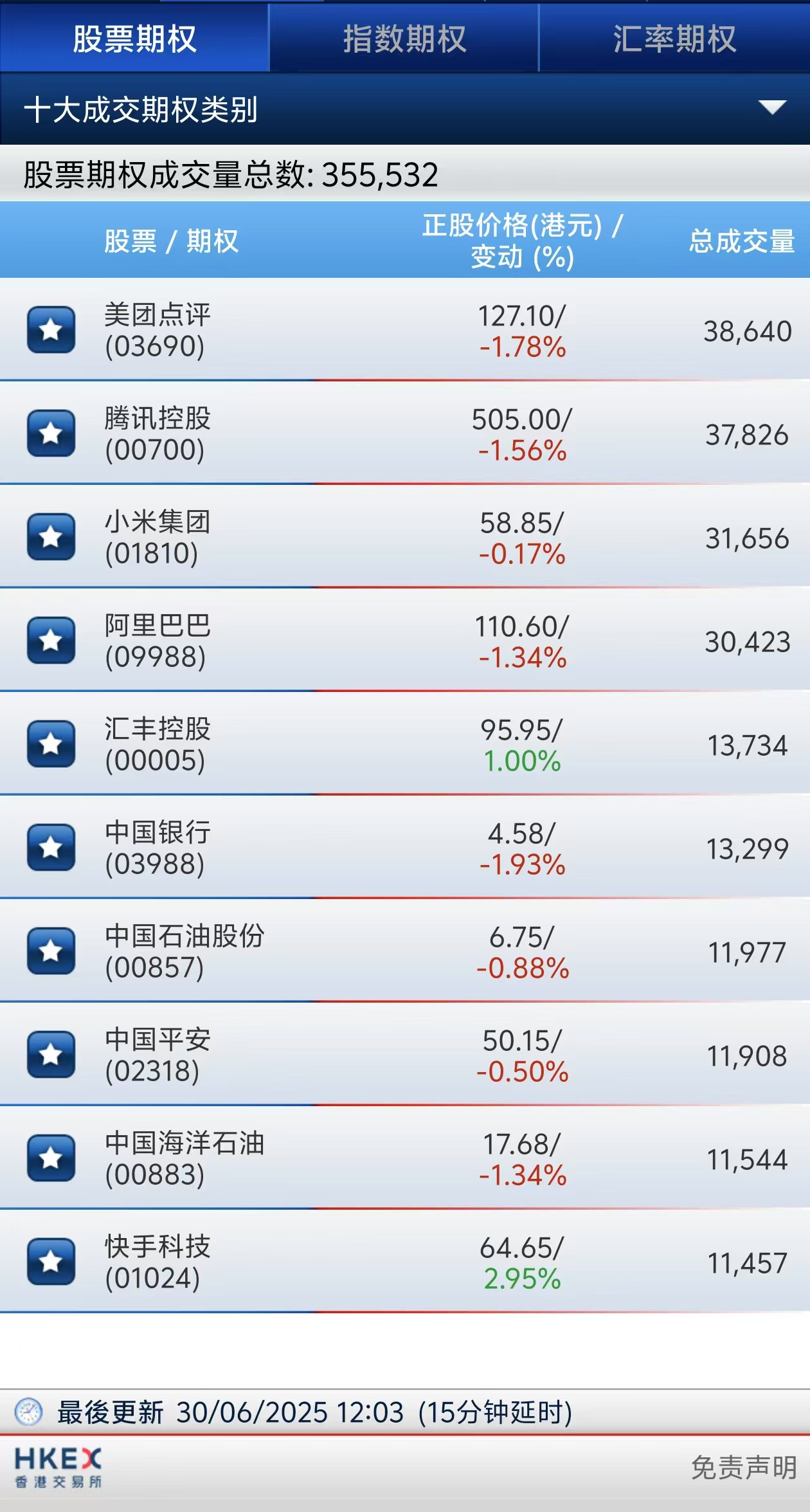 本周一(6月30日)截止午间收盘,港股期权半日成交量达到355,532张,其中 美团-W 个股期权成交量最大,达3.9万张; 腾讯控股 名列次席,期权成交3.8万张; 小米集团-W 居第三,期权成交3.2万张。