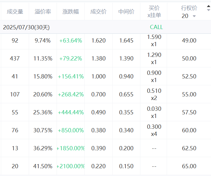 周一早盘 中芯国际 一度涨超6%,截止午间收盘涨幅2.9%,报46.15港元。期权链上Call单集体飙升,成交量最高的是7月30日到期行权价50港元的认购期权 $中芯 250730 50.00 CALL$ ,半日涨幅达79.22%,同日到期行权价65港元的 $中芯 250730 65.00 CALL$ 半日涨幅高达2100%!