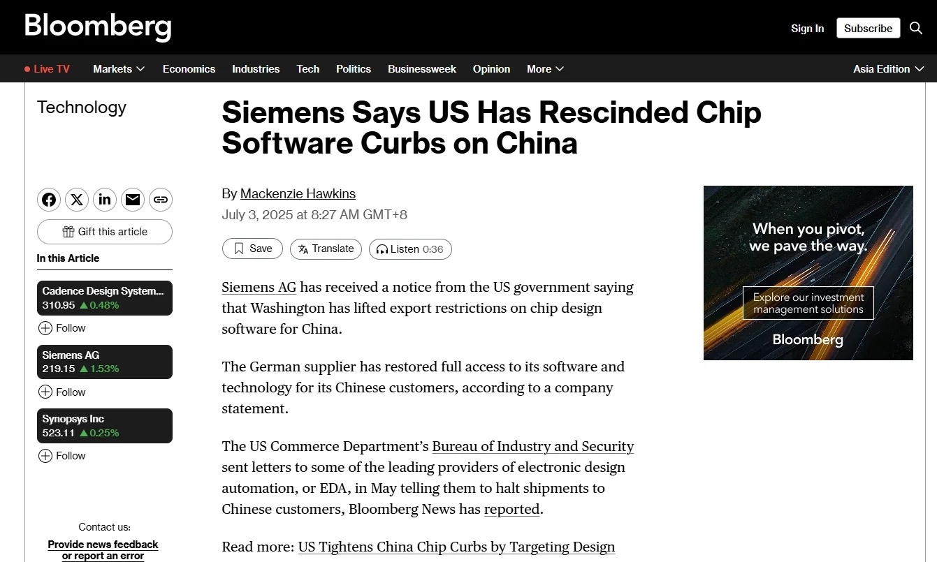 7月3日,据彭博报道,西门子收到美国政府通知,称华盛顿已解除对中国芯片设计软件的出口限制。该公司在一份声明中表示,这家德国供应商已恢复其中国客户对其软件和技术的全面访问。