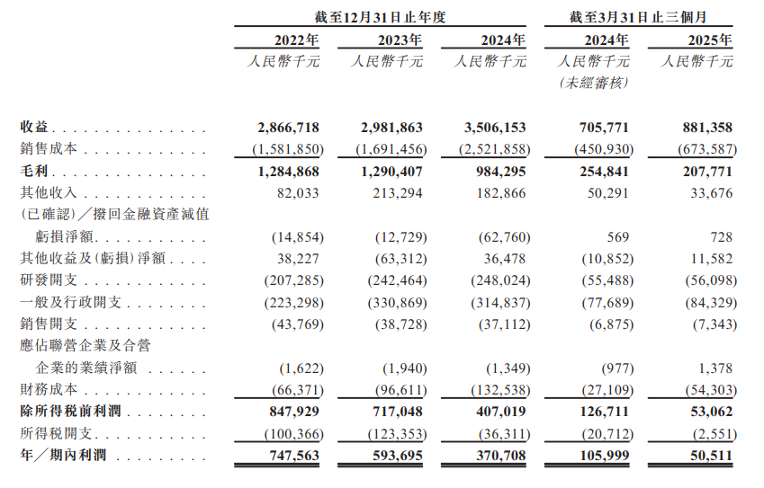 2022-2024财年,及2025年截至3月31日止三个月,公司分別录得收入28.67亿元(人民币,下同)、29.82亿元、35.06亿元及8.81亿元;对应同期,年内/期内利润分别为7.48、5.94亿元、3.71亿元及5051.1万元。