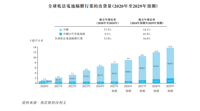复合年增长率为51.0%。2024年,中国占全球出货量的94.7%,保持市场主导地位。展望未来,全球出货量预计将由2024年的64亿平方米增长至2029年的138亿平方米,复合年增长率为16.4%。随着中国企业加快海外扩张,其他国家的制造商提高产能及客户基础,中国以外地区的干法隔膜出货量份额预计将从2024的5.3%上升至2029年的14.2%,复合年增长率为41.8%。
