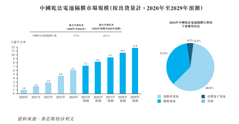 按出货量计算,全球电池隔膜市场规模从2020年的64亿平方米增至2024年的277亿平方米,复合年增长率为44.5%。于2024年,中国的电池隔膜出货量为全球第一,占主要国家市场约84.0%。