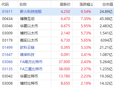华盛资讯7月10日消息,港股早盘,比特币概念股全线走高,截至发稿,新火科技控股涨超9%,博雅互动涨超7%,华夏以太币、博时以太币、嘉实以太币、欧科云链涨超5%,雄岸科技涨超3%。
