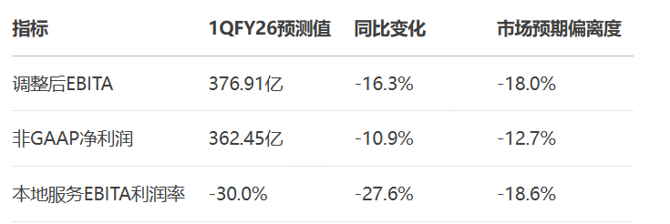 预计F1Q(2026财年第一季度)整体调整后EBITA同比下降16%,收入仅微增2%(剔除资产分拆影响后为双位数增长)。