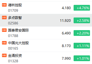 稳定币概念股开盘上扬,德林控股涨近5%,OSL集团、国泰君安国际涨超2%,中国光大控股、今涌投资涨超1%。
