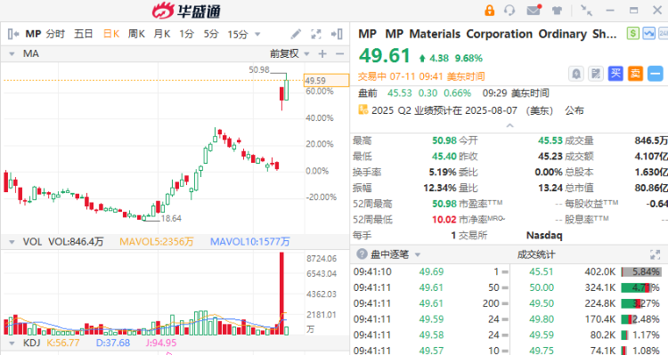 稀土概念股续涨,MP Materials $MP 、涨超10%, $USAR 涨超2%;消息面上,五角大楼昨日宣布将入股稀土公司MP Materials。