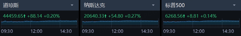 周一,美股三大指数集体收涨,截至收盘,标普500指数涨0.14%,报6268.56点;纳斯达克综合指数涨0.27%,报20640.33点;道琼斯工业平均指数涨0.2%,报44459.65点。