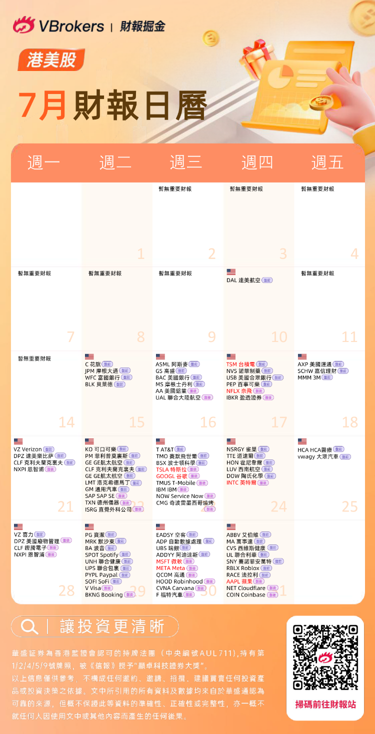 此外,阿斯麦、可口可乐、联合健康、强生、宝洁、波音、英特尔、IBM、高通、Coinbase等行业龙头也将在7月披露最新财报。