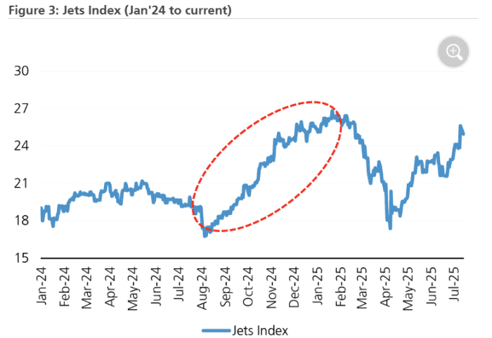 去年,受供应收紧、第四季度强劲的航空出行需求及燃油成本下降的推动, U.S. Global Jets ETF (代码JETS)从2024年8月到年末上涨了45%。
