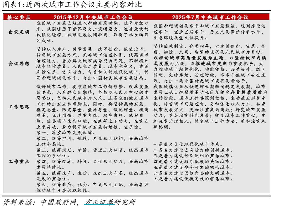 对比2015年会议聚焦城市基础设施建设、新型城镇化推进和城市规划改革,2025年的此次会议在发展理念、工作重点和政策导向上有明显变化。本次总基调以稳为主,突出“内涵式发展”与“高质量发展”,强调“分类指导”“因地制宜”“统筹协调”,显示出政策在城市治理和经济发展中更趋理性和中长期导向。同时,此次会议更着重于城市体系优化、城市更新、绿色低碳发展及城市治理现代化,展现了城市发展思路的持续演进。