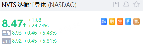 纳微半导体续涨5%,隔夜股价大涨近25%。