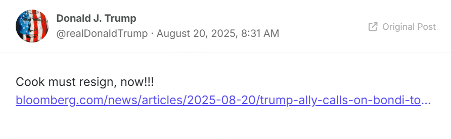 特朗普在社交媒体表示:美联储理事库克必须立即辞职!!!