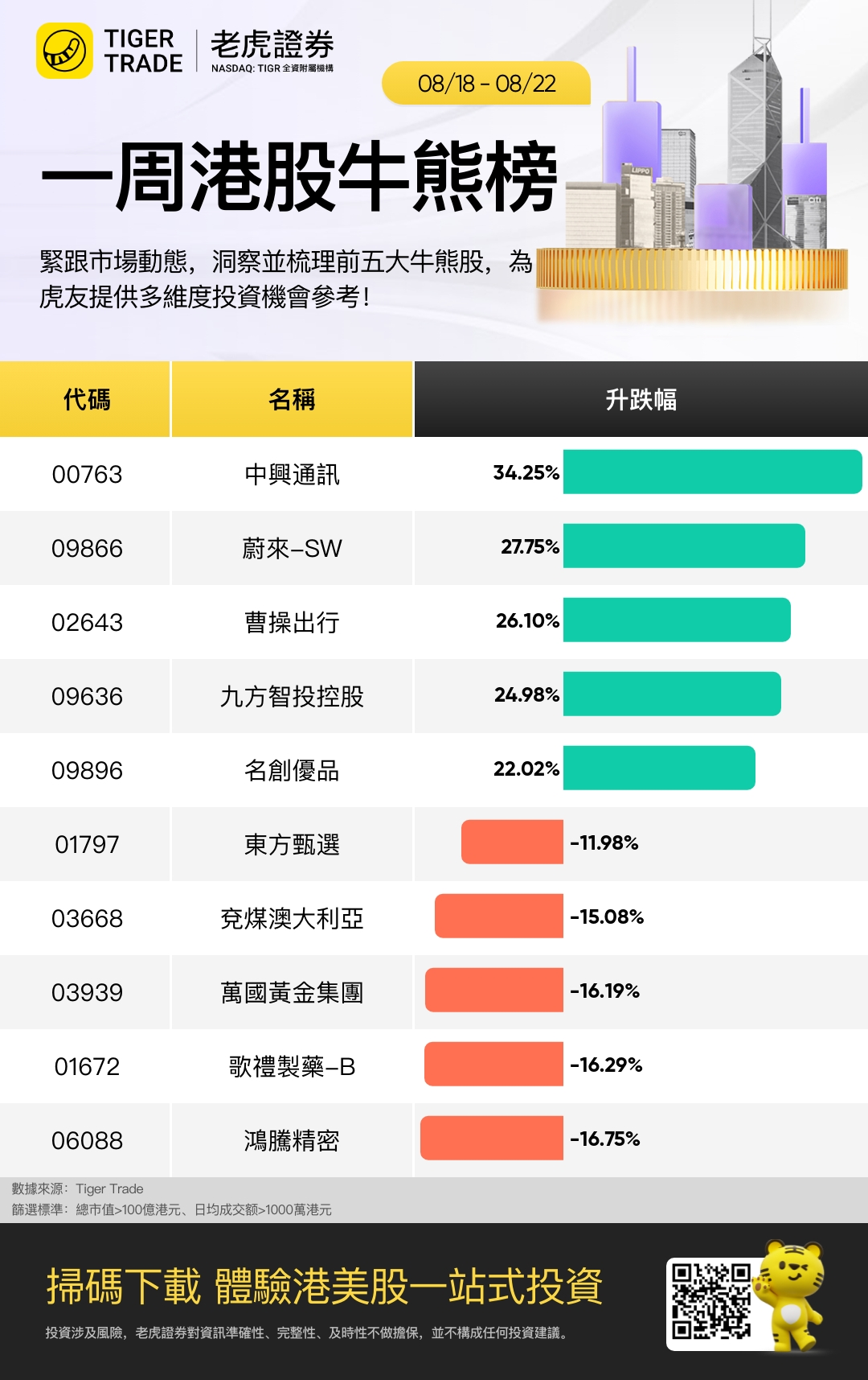 本周市值百亿以上、日均成交千万以上表现最好五只股票是 中兴通讯、 蔚来-SW、 曹操出行、 九方智投控股 、名创优品 ;