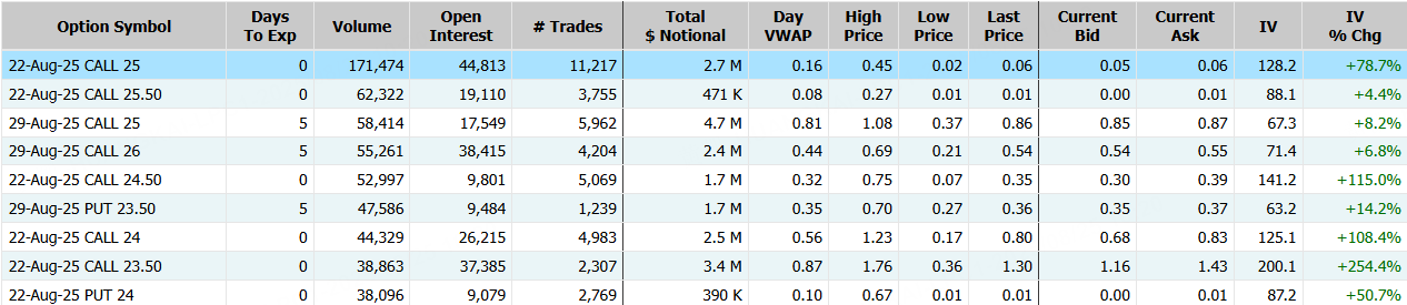 英特尔上周五涨近6%,期权合约成交148.14万张,较90日均量放大3.6倍。8月22日到期的25美元的行权看涨期权交易量特别高,共有171,474份合约交易。