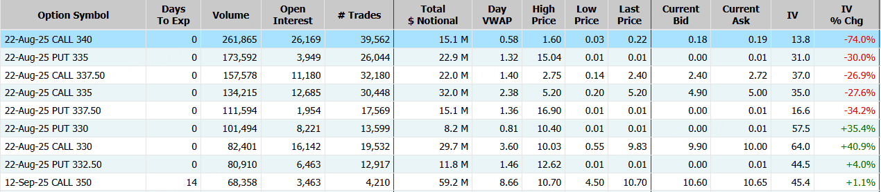 特斯拉上周五收高6.22%,期权合约成交344.23万张,8月22日到期的340美元的行权看涨期权交易量特别高,共有261,865份合约交易。