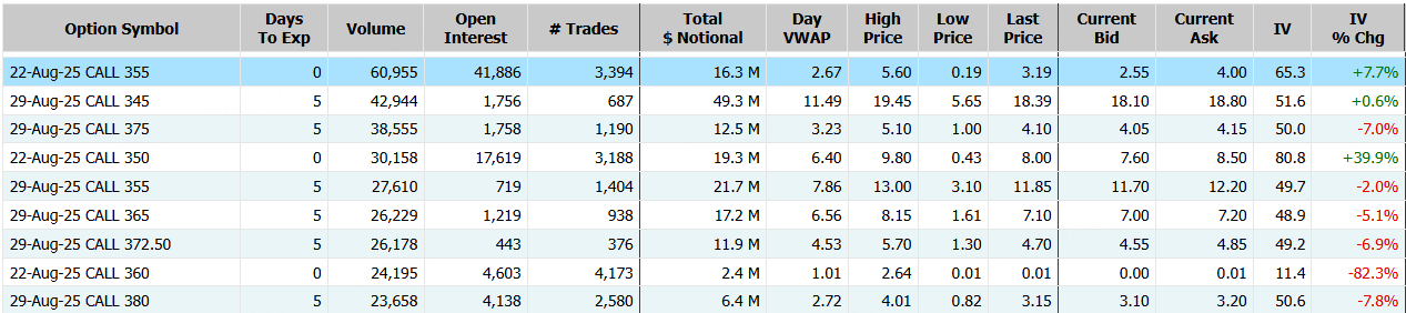 Strategy上周五收高6.09%,期权合约成交115.42万张,较90日均量放大2.1倍。8月22日到期的355美元的行权看涨期权交易量特别高,共有60,955份合约交易。