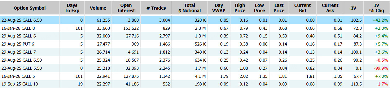 蔚来上周五涨超14%,期权合约成交95.64万张,较90日均量放大6.4倍。8月22日到期的6.50美元的行权看涨期权交易量特别高,共有61,255份合约交易。