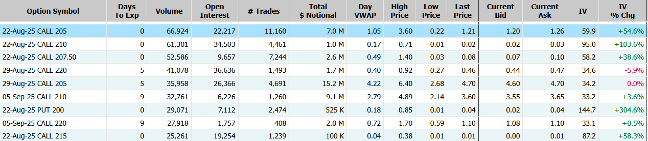 谷歌A上周五涨超3%,期权合约成交92.89万张,较90日均量放大2.1倍。8月22日到期的205美元的行权看涨期权交易量特别高,共有66,924份合约交易。