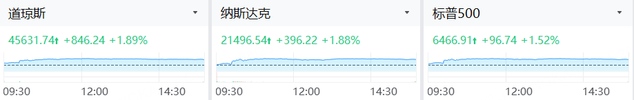 截至收盘,道指涨846.24点,涨幅为1.89%,报45631.74点;纳指涨396.22点,涨幅为1.88%,报21496.53点;标普500指数涨96.74点,涨幅为1.52%,报6466.91点。