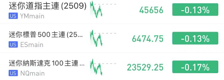 华盛资讯8月21日消息,美股三大指数期货盘前微跌,纳指期货 $NQmain 跌0.17%,标普500期货 $ESmain 跌0.13%,道指期货 $YMmain 跌0.13%。