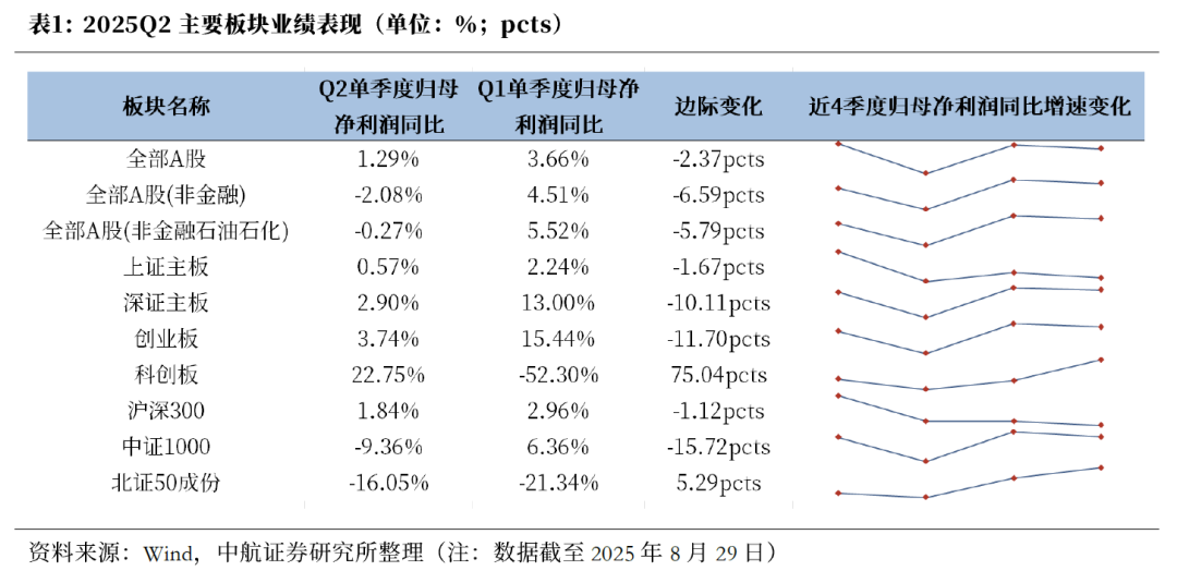 对比主要板块业绩情况,二季度板块业绩表现分化。板块盈利趋势上看,2024年四季度以来,仅上证主板仍延续回落趋势,而深证主板、创业板和科创板近两个季度较2024年四季度均呈现出见底回升趋势,其中科创板改善趋势最为明显。边际变化来看,多数板块同比增速较一季度明显回落,其中创业板回落幅度最大,仅科创板改善,且改善幅度大。具体来看,上证主板二季度归母净利润同比为0.57%,较一季度回落1.67pcts;深证主板保持正增长,同比增速为2.90%,较一季度增速下降10.11pcts;创业板二季度增速为3.74%,虽仍保持正增长,但较一季度环比下滑11.70pcts,下滑幅度最大;但科创板表现亮眼,二季度归母净利润同比增速为22.75%,由一季度同比负增长转正环比大幅改善75.04pcts。