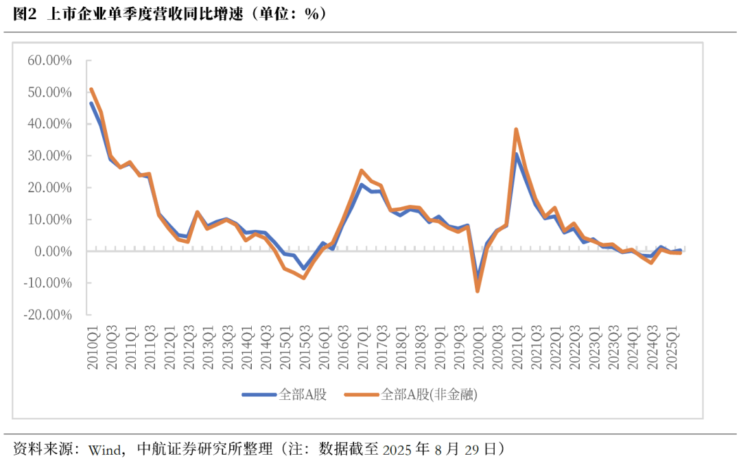 当前A股营收和盈利的恢复趋势仍需巩固,本轮牛市处于估值驱动阶段。截至8月29日23:00时,上市公司中报数据,2025年二季度全部A股营收略有改善,但盈利端在一季度大幅改善后,二季度小幅回落。金融板块在营收和利润上均起到显著拉动效应。全部A股二季度营收同比增速均较一季度提升并由负转正,但全部A股非金融反而负增进一步走阔,意味着金融板块对营收贡献明显。盈利能力方面,全部A股和全部A股非金融二季度归母净利润同比增速较一季度均有所回落,但仍大幅优于2024年四季度表现,金融板块同样对盈利支撑较为明显。整体法口径下,2025年二季度全部A股/非金融单季度营收同比增速分别为0.34%和-0.54%,较一季度分别增长0.67pcts和下降0.13pcts;二季度归母净利润同比增速分别为1.29%和-6.59%,较一季度分别下降2.37pcts和6.59pcts。
