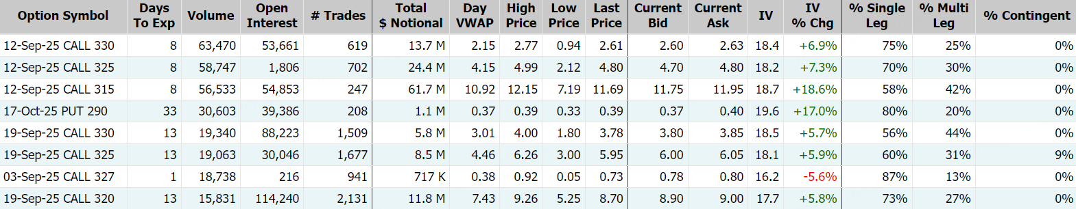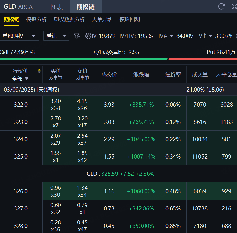 期权方面,SPDR黄金ETF当日期权成交100.38万张,较90日均量放大近3倍,看涨期权占比72%,其中于9月12日到期的330美元行使价的看涨期权成交居前,成交逾6.3万张;此外,从期权链上看,SPDR黄金ETF多张Call单翻倍大涨,最高飙涨逾10倍。 $GLD 20250912 330.0 CALL$ $GLD 20250903 326.0 CALL$