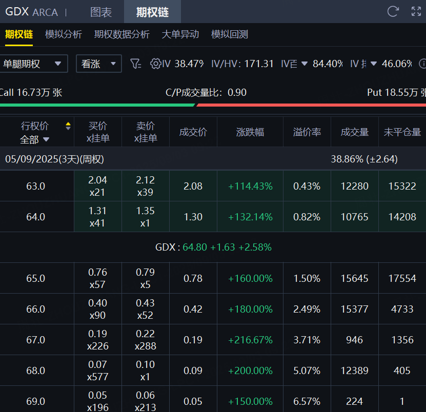 黄金矿业ETF-VanEck当日期权成交35.28万张,较90日均量放大逾3倍,看涨期权占比47.4%,其中于12月19日到期的52美元行使价的看跌期权成交居前,成交逾4万张;此外,从期权链上看,黄金矿业ETF-VanEck于9月5日到期多张Call单翻倍大涨。 $GDX 20251219 52.0 PUT$ $GDX 20250905 68.0 CALL$